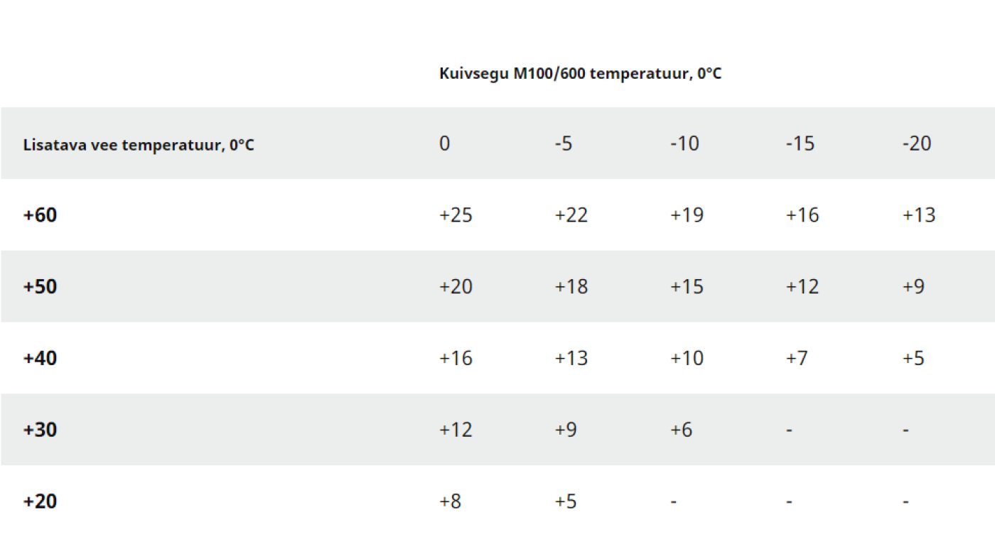 Alljärgnev tabel toob välja valmissegu temperatuuri sõltuvuse kuivsegu ja vee temperatuurist.